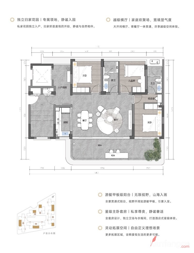 3. 户型设计优越,专梯专户、大阳台、奢阔横厅等配置,兼具实用性与尊贵感。